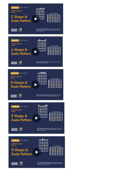 Thru the various “letter-lessons” – (C, then A, then G, etc), the lesson gives a scale shape for each “letter” in CAGED.