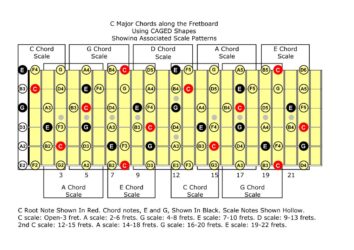 Well, I guess I can’t help myself. Here is the diagram showing the C major chord in the CAGED chord shapes within the associated scale pattern. One file is a pdf and the other is jpg. I have never seen any other attempts to show these as they all over lap. But if you look at this chart carefully, you will be able to “see” the CAGED chords and the scale patterns.