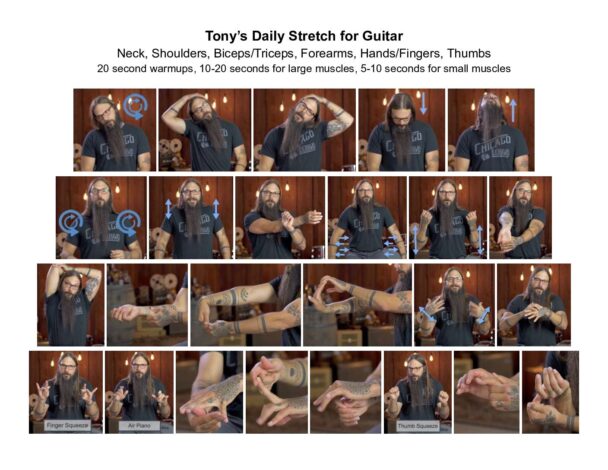 I don’t have any experience with low tension strings – in fact this is the first I have heard of them. @the-old-coach ‘s and @Cadgirl ‘s advice on stretching is spot on. I took the skills course they indicated and it did wonders for both my playing and the “after playing soreness”. There was a post a while back from a gentleman that was kind enough to put together a picture guide of the stretches from the skills class. I’ve attached them so you can take a look. I have this saved on my computer and the first thing I do when I start my guitar routine are these stretches. If I don’t follow through – I can feel it during my playing and the next day. Here is the file – all credit and a thank you to the gentleman that made it!
