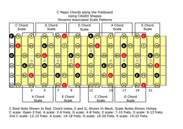 Here is a chart showing all the natural notes on the fret board. It also shows all 5 chord shapes and the associated 5 scale patterns.